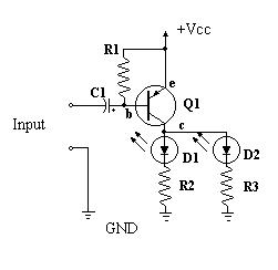 This project more than a useful tool, is a fun project to build. It can be used in a vast variety of ways, to dress audio projects, to make a party lights, to test audio signals, or just for fun. It is also a great way to learn the properties of the transistor. The circuitThe audio indicator consists of three things: An indicator, a frequency switch, and an isolator. Knowing these three things needed, I thought of each one and came up with the following: LED's as indicators, a transistor as the switch, and a capacitor to isolate the current of the circuit from the audio source. When an analog signal is introduced to the circuit, in this case an audio signal, it goes through the capacitor C1. This capacitor works as an isolator. It protects the audio source from making direct contact to the current of the circuit. The capacitor also works as a filter. Depending on the capacitance of it, it filters different frequenceis. I have choosen a 470 mfd capacitor because with this value you get most of the frequency range in an audio signal. Choosing a capacitor with a smaller capacitance would result in filter of higher frequencies, and you will not get a very defined indication response in the LEDs. The transistor responds better at lower frequencies. The transistor Q1 is the frequency switch. The current pushed by the audio signal in the capacitor then goes through the transistor. This amplifies it by letting a higher amount of current go from the emitter to the collector. This action ocurrs when the base is saturated with a negative current which is produced when a low frequency pulse from the audio signal enters the capacitor. As the current from the base increases or decreases, the output of the collector is higher or lower respectively. This is then connected to a resistance that protects the LEDs from excessive currents. This is then directly connected to the anodes of the LEDs. One last thing to mention in the circuit is a resistance connected to the capacitor. Capacitors tend to discharge when other components take current from them if they are not being recharged. This resistance is connected to the positive side of the capacitor and to the positive pole of the power input. The resistor is constantly supplying current to the capacitor so that it can keep conducting current through the base of the transistor. If this resistor was not there, the circuit will work for less than ten seconds and the indicator would gradually dim until it turns compleatly off. This is due to the lack of current in the base of the transistor that is needed to turn the transistor on.